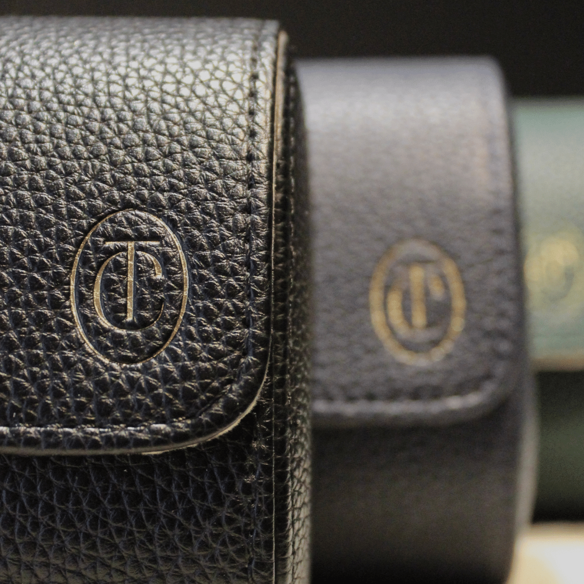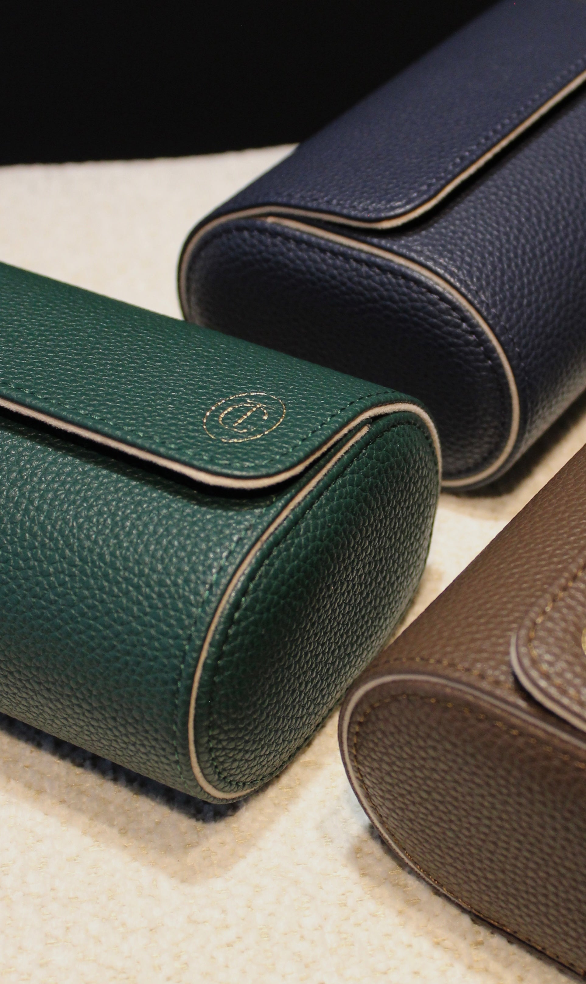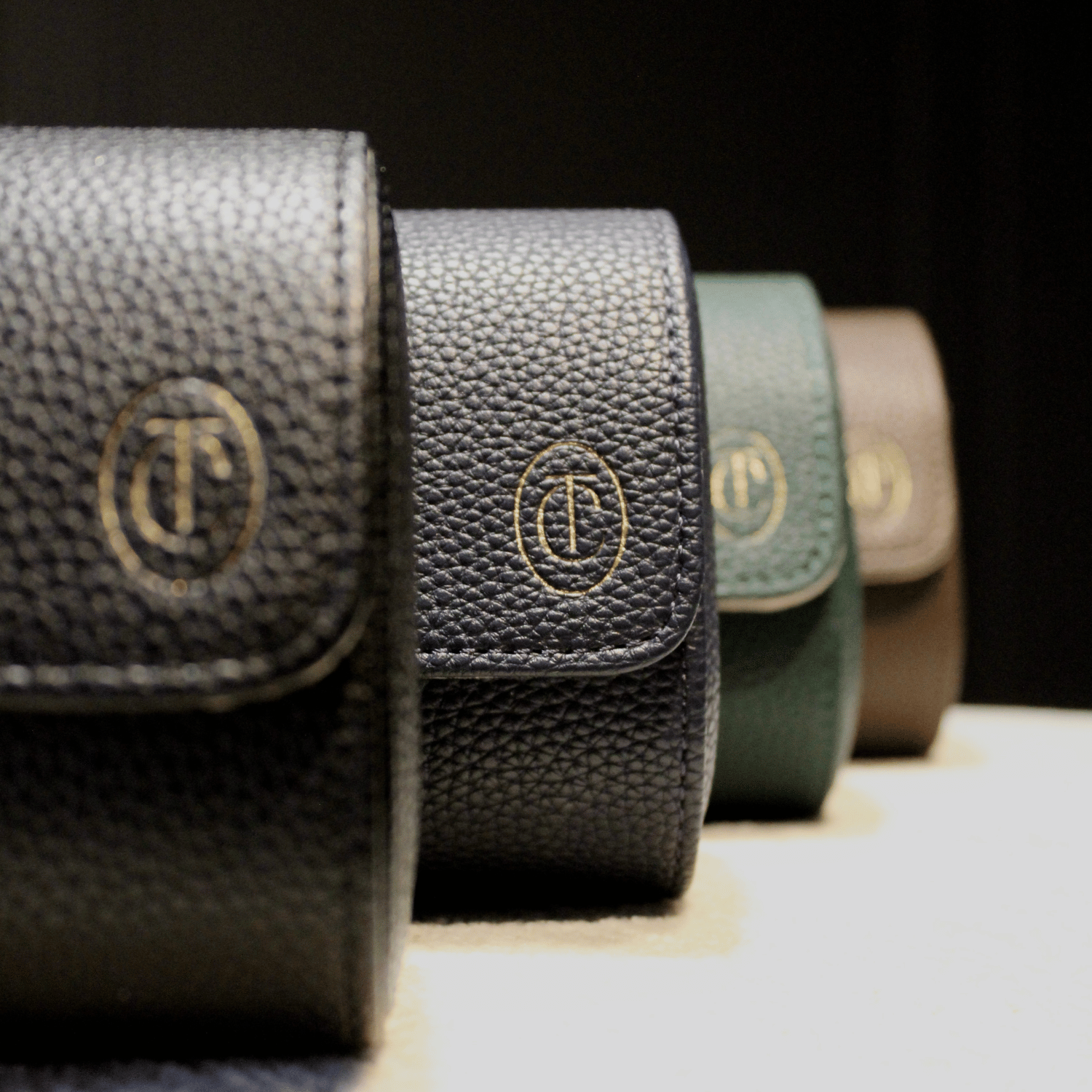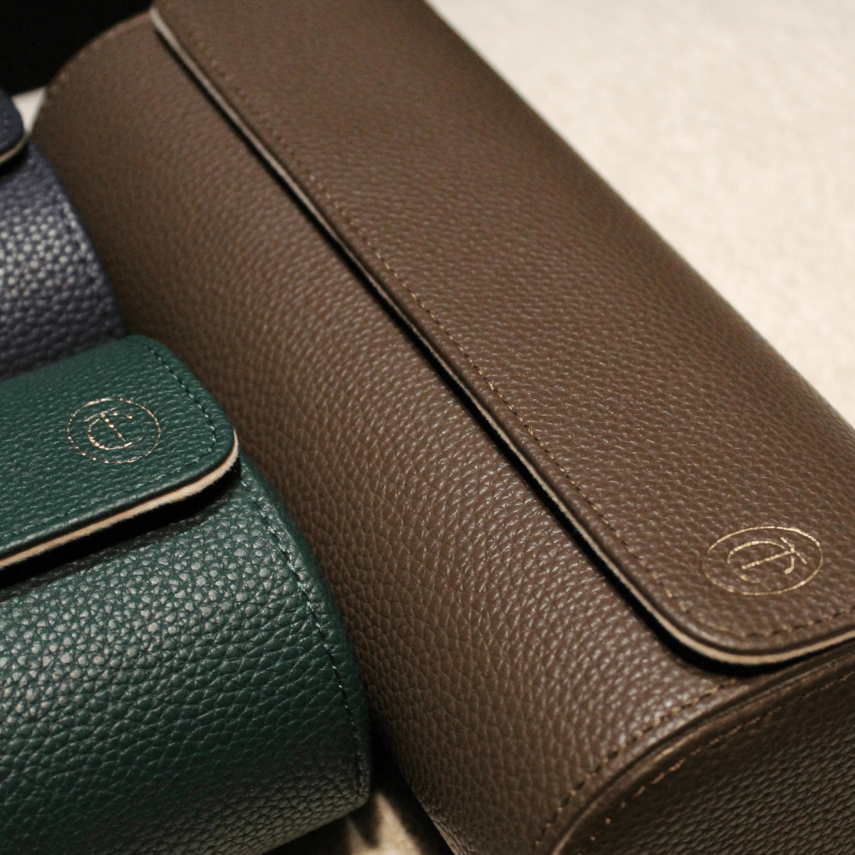 Nasz pokrowiec podróżny został zaprojektowany z myślą o przechowywaniu zegarków, w tym przypadku dla trzech zegarków. Jest wykonany dla nas z matowej teksturowanej skóry dostępnej w czterech głębokich kolorach: nocny granat, elegancka zieleń, krucza czerń i miodowy brąz. Wnętrze wyłożone jest materiałem welwetowym, zapewniając maksymalną ochronę przed rysami, a owalna poduszka w łatwy sposób się wypina z pokrowca, ułatwiając zapięcie bransoletki lub paska zegarka. Pokrowiec jest zabezpieczony za pomocą zewnętrznego zatrzasku, a subtelny sygnet Timecatchers znajduje się w dolnym prawym rogu zewnętrznej klapki. Ponieważ każdy z naszych pokrowców jest wykonywany ze skóry, prosimy o uwzględnienie drobnych różnic w kolorze lub teksturze.